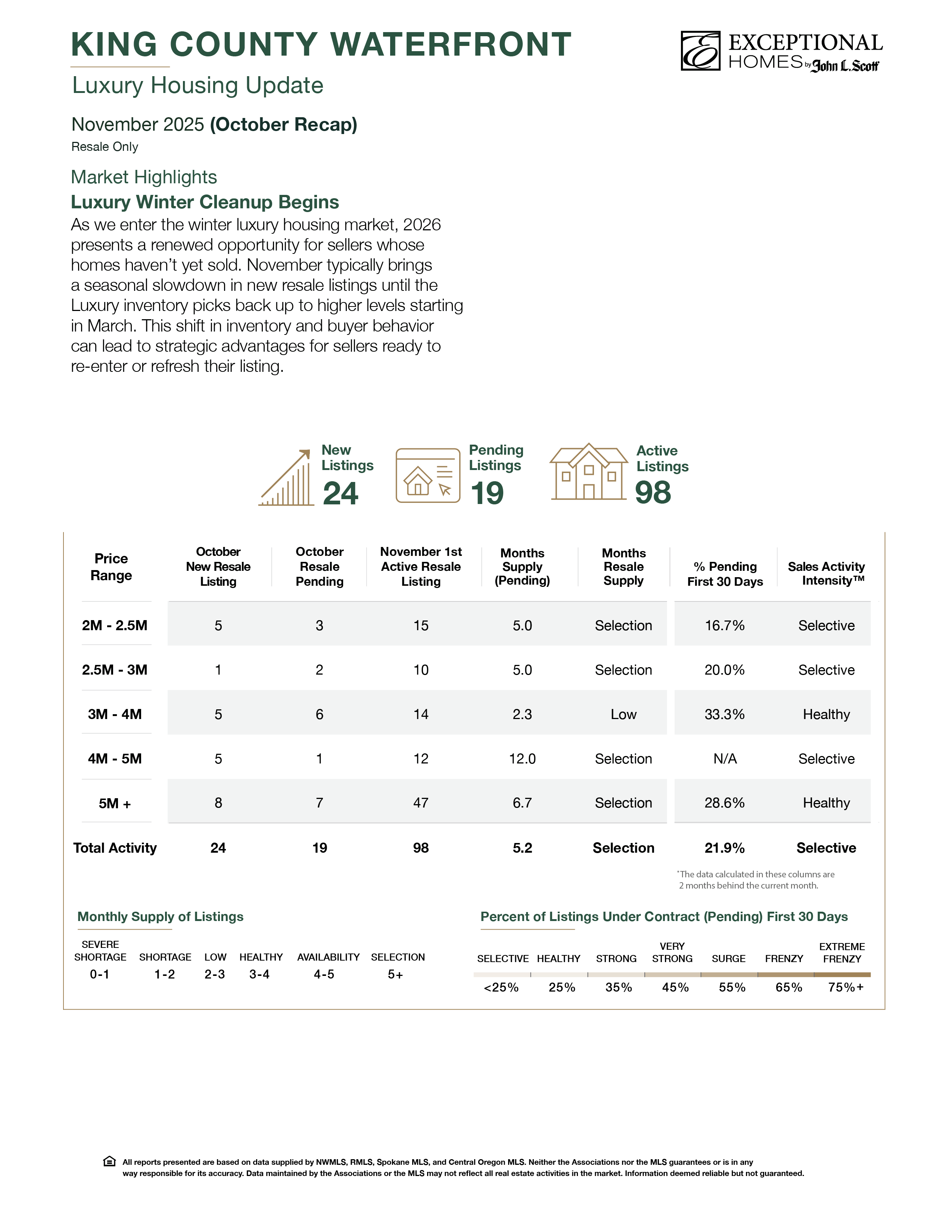 November typically brings a seasonal slowdown in new resale listings until the Luxury inventory picks back up to higher levels starting in March. This shift in inventory and buyer behavior can lead to strategic advantages for sellers ready to re-enter or refresh their listing.